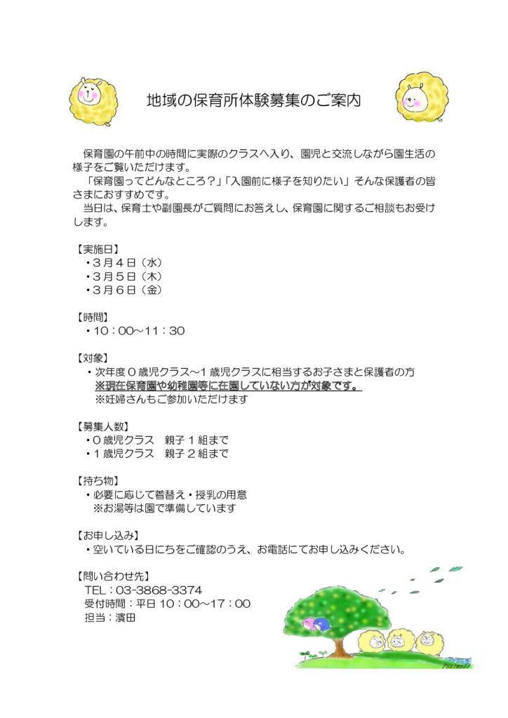 地域の保育所体験募集のご案内 2026年2月16日 ニュース 「保育園ってどんなところ?」「入園前に様子を知りたい」 そんな、これから保育園探しを検討される保護者の皆さまや、妊婦さんのご参加をお待ちしております。当日は実際のクラスに入り、園児との交流や園生活の様子をご覧いただけます。 保育士や副園長がご質問にお答えする相談の時間もございますので、ぜひお気軽にご活用ください。 お知らせ一覧へ戻る 前へ